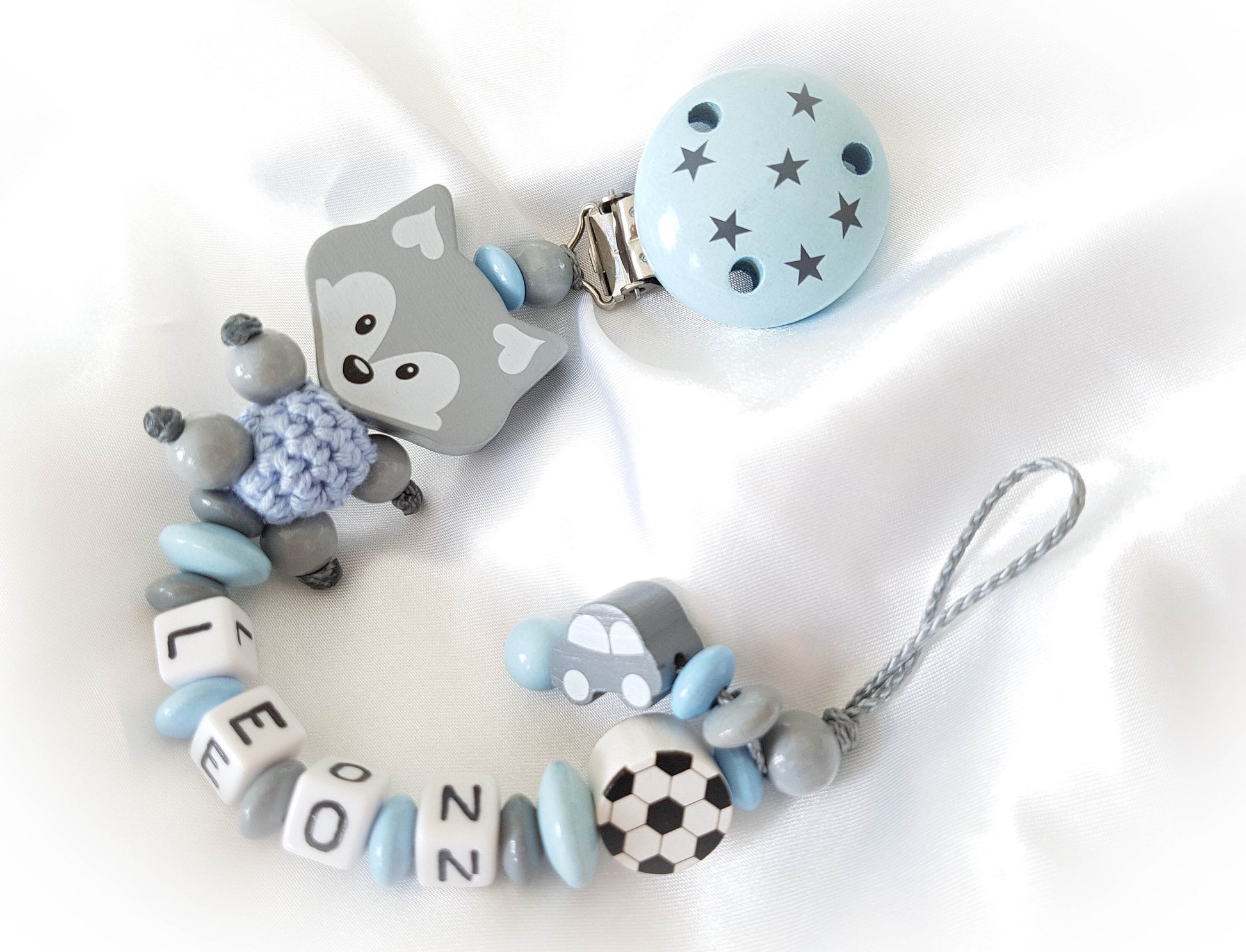 Individuelle Schnullerkette mit dem Namen des Kindes - macht Ihren Liebling unverwechselbar und zu etwas ganz Besonderem. Egal ob als persönliches Geschenk zur Geburt oder Taufe - in liebevoller Handarbeit gefertigt ist dieses Unikat garantiert ein Blickfang.