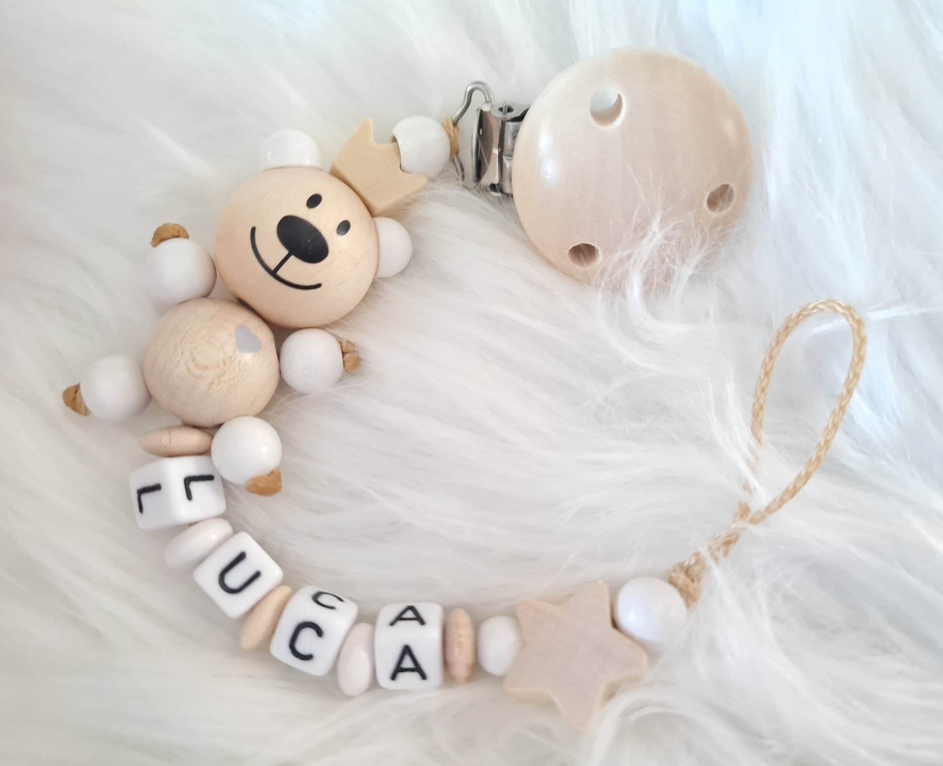 Schnullerketten mit Teddy/ Fuchs: Namen ab 7 Buchstaben entfallen die Linsenperlen zwischen den Buchstaben